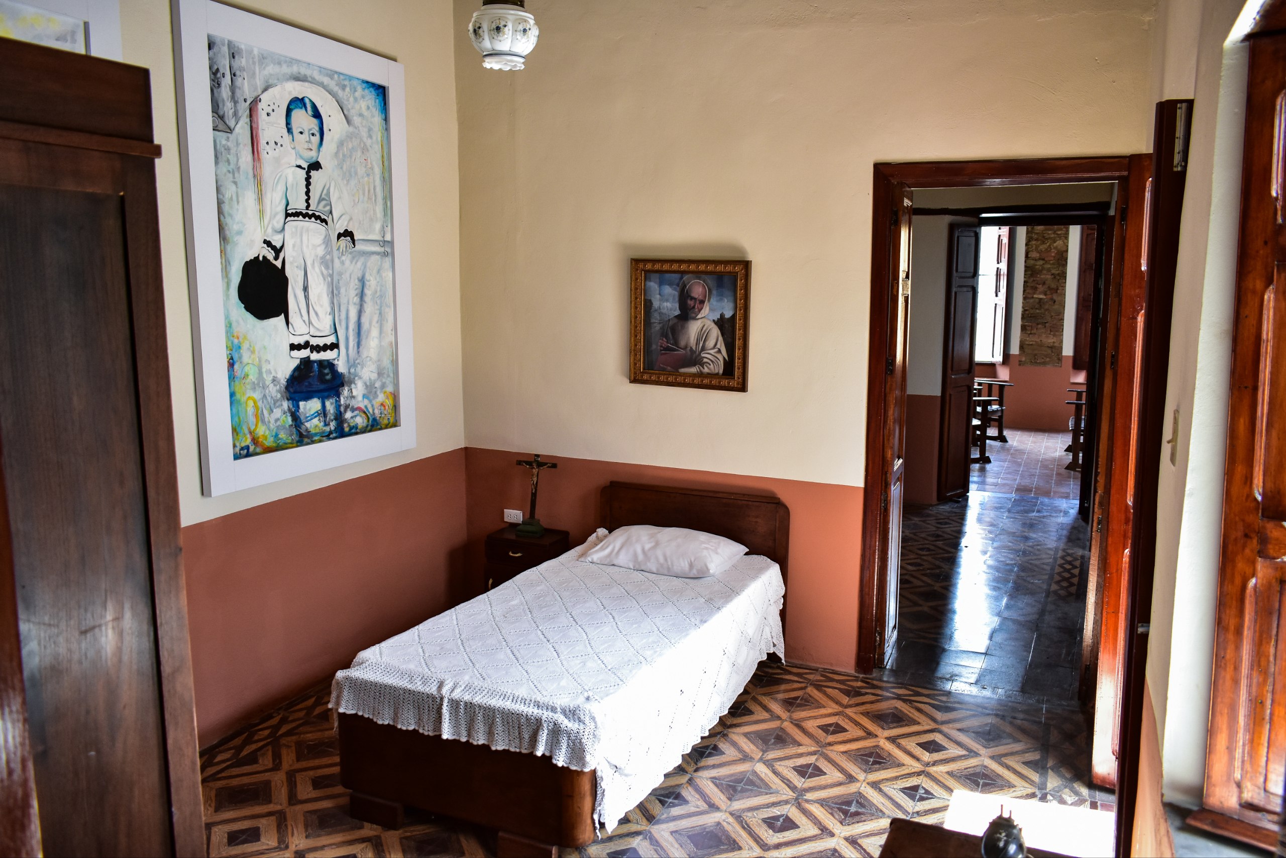 Por último, su dormitorio, donde se encuentra la mueblería que revive el tiempo. Una cama de madera, una cómoda con su espejo, y otras pertenencias reflejan la austeridad del médico de los pobres.