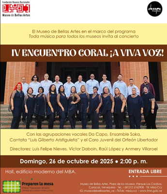 El Museo de Bellas Artes en el marco del programa "Toda música para todos los museos" invita al concierto: IV encuentro coral ¡A Viva Voz! con las agrupaciones vocales Da Capo, Ensamble Soka, Cantata Luis Gilberto Aristiguieta y el coro juvenil del Orfeón Libertador.