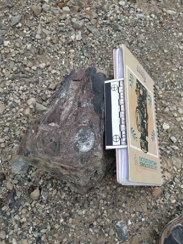 Habíamos conseguido restos de organismos. En una oportunidad, mi profesor, que es mi sensei, por decirlo, el ingeniero geólogo Rodolfo Sánchez, sube por una ladera y consigue un nódulo. Con el martillo geológico él lo fractura y en su interior, en las tres partes fracturadas consigue este cráneo ictiosaurio.