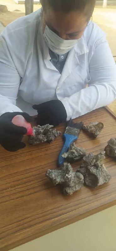 Después del campo vamos al laboratorio donde debemos tener todos esos precedentes en mente y, por lo tanto, realizar un embalaje adecuado para poderlo trasladar al laboratorio donde comienza la preparación de este material. Se cubrió la zona con papel higiénico, se adhirió para proteger el material del vertebrado y eso fue en los tres segmentos. Luego, se llevó a la oficina donde se realizó una preparación de un consolidante que es una película acrílica que se aplica para que el material óseo se mantenga y no se fracture. Se realiza con Paraloid B-72 y con algún soluto que podría ser tíner o acetona. En este caso fue tíner.
