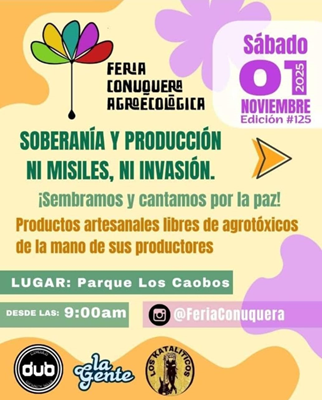 Vuelve La Feria Conuquera otro sábado al parque Los Caobos esta vez musicalizada por Dub Community sello, La Gente banda de Yaracuy y Los Katalicos. Siembra y canto.