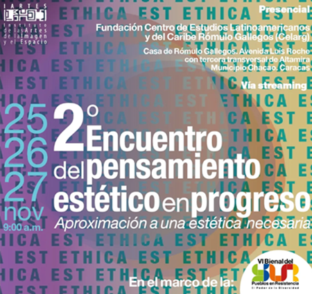 El Instituto de las Artes de la Imagen y el Espacio (IARTES), en el marco de la VI Bienal Internacional del Sur, Pueblos en Resistencia, se complace en invitarles al 2º Encuentro del pensamiento estético en progreso. Aproximación a una Estética Necesaria, en la sala de conferencias de la Fundación Centro de Estudios Latinoamericanos Rómulo Gallegos (CELARG). Este martes, miércoles y jueves.