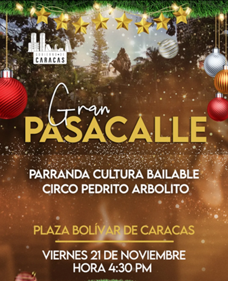 El Gobierno de Caracas te invita al Gran Pasacalle este viernes 21 de noviembre a partir de las 4:30 pm en la icónica plaza Bolívar, con la participación especial de la Parranda Cultural Bailable y el Circo Pedrito Arbolito.