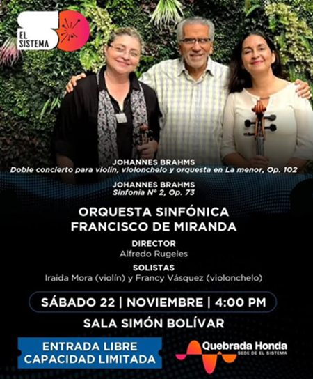 La Orquesta Sinfónica Francisco de Miranda, bajo la dirección del maestro Alfredo Rugeles, junto a las solistas Iraida Mora (violín) y Francy Vásquez (violonchelo), ofrecen al público este maravilloso concierto.