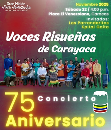 Misión Cultura y la Gran Misión Viva Venezuela Mi Patria Querida, se complace en invitar al pueblo venezolano a celebrar el 75º aniversario de Las Voces Risueñas de Carayaca. Plaza El Venezolano del centro de Caracas.