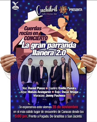 El Cuchitril Café Bar, les invita a disfrutar de La gran parranda llanera 2.0, con la agrupación: Cuerdas Recias, integrada por: Daniel Ponce, Emilio Pereira, Moisés Aranguren, Oscar Itriago, y Jonny Pacheco. Frente a Fogade, De Gradillas a San Jacinto, Caracas.