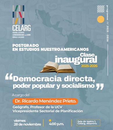 El viernes 28 de noviembre a las 4:00 pm, arranca el Postgrado en estudios nuestroamericanos 2025-2026 con la clase inaugural: “Democracia directa, poder popular y socialismo”. En el CELARG Altamira.
