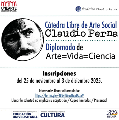 La UNEARTE y la Fundación Claudio Perna te invitan a formar parte de una experiencia única: Diplomado de Arte, Vida, Ciencia de la Cátedra Libre de Arte Social Claudio Perna.