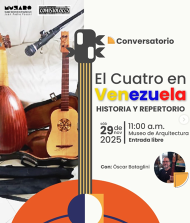 Únete a nosotros en el Museo de Arquitectura en la avenida Bolívar para un interesante conversatorio con historiadores sobre El cuatro en Venezuela: Historia y repertorio. Entrada libre.