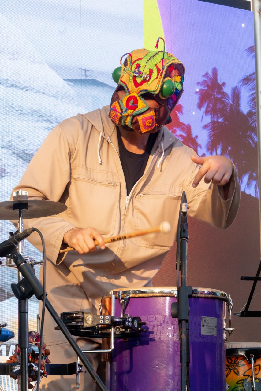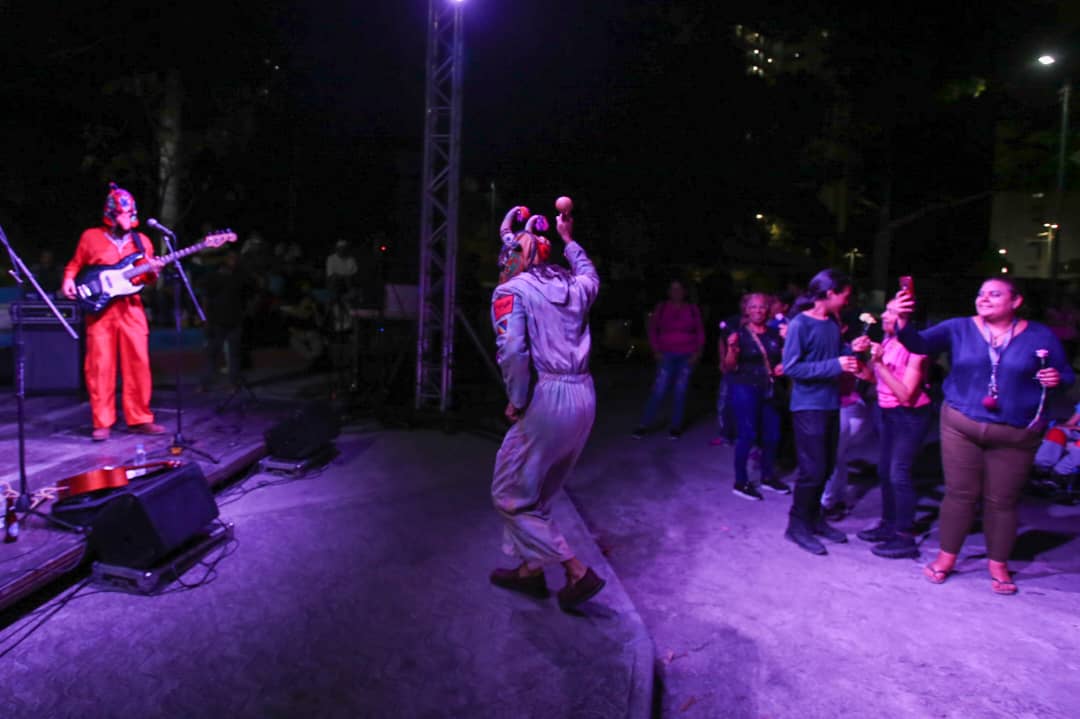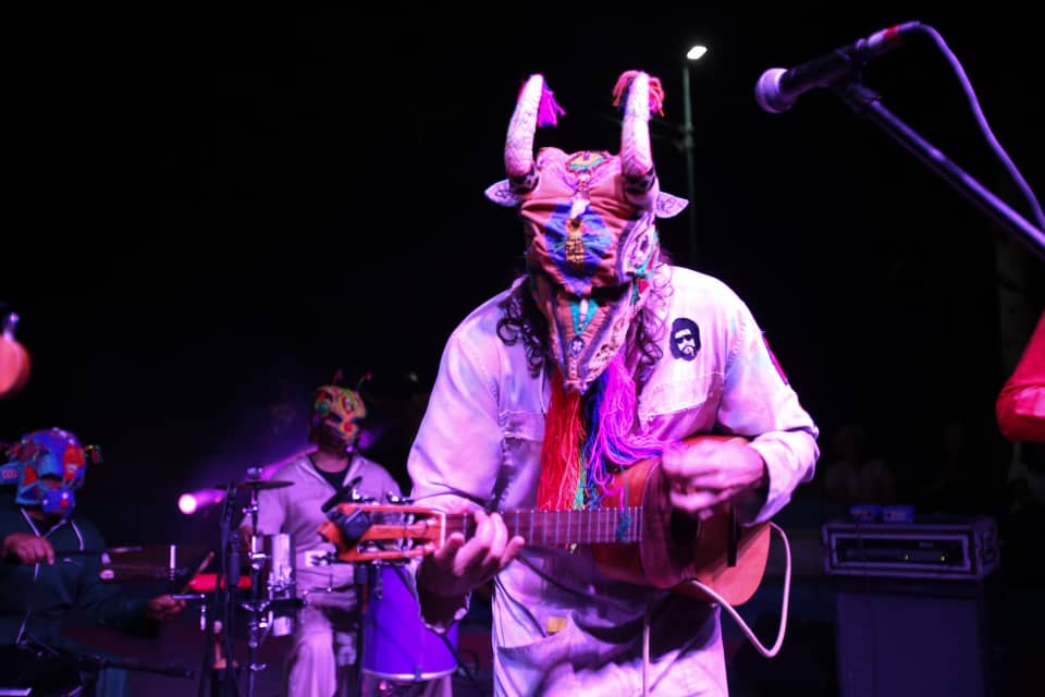 Sandino: Comenzó con el albúm La Alborada, que lo grabé por allá en el 2011 en Barquisimeto y me llevó como dos o tres años. Imagínate yo viviendo en Caracas, naciendo mi primer hijo, moviéndome, viajando, organizando la vida. Por la terquedad logré grabarlo en Barquisimeto, y resulta que el ingeniero de sonido se muda del país, entonces comenzó a mezclarlo aquí y lo terminó allá y yo: “tranquilo hermano, ya ha pasado demasiado tiempo, este albúm va a salir, sabemos la presión que hay, y no es más que nuestra porque aquí no hay una disquera de por medio, aquí somos nosotros nuestros propios patrones”. Estuvo listo en el 2017 y en todo ese tiempo ya yo había pensado mucho. Ya en el 2013 estaba buscando una máscara de gallo pero lo que veía no me terminaba de convencer porque casi todo era de plástico, entonces no, pero seguía con la jodedera de ponerme máscaras para joder con los carajitos, le compraba antifaces a mis hijos, para los amigos en los cumpleaños y mi compañera me dijo “¿por qué no le dices a ella para que haga la máscara de gallo?” y le comenté, ella no había hecho algún encargo así antes, le expliqué qué era el gallo y lo que quería con él y me la entregó un enero de 2018, así hicimos el video de la Alborada Guiando, que abre el primer sencillo de ese albúm en su lanzamiento en 2018. Y ahí empecé a entrar desde el público jodiendo con la gente y el gallo atorrante (jajajaja). Me enamoró mucho más ver la reacción de los carajitos y ahí empezamos a divertirnos, haciendo esto juntos. La misma Yelitza López, la creadora de estas máscaras, terminó en diálogo con nosotros para hacer el resto de las máscaras. Ellas misma fue definiendo qué animal haría para cada uno y ahí salió el cardenal y un araguato. Ella conectaba porque es una muñequera también, un privilegio, de verdad. Eso pica y se extiende, ahí están haciendo nuevas máscaras, ya van a ver. A las semanas vimos en una historia de Instagram a la pulpa, una nueva máscara.