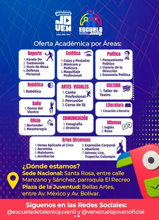 La Escuela de Talento y Participación Juvenil de la Gran Misión Venezuela Joven te invita a inscribirte en los cursos y talleres 100% Gratuitos que ofrece.