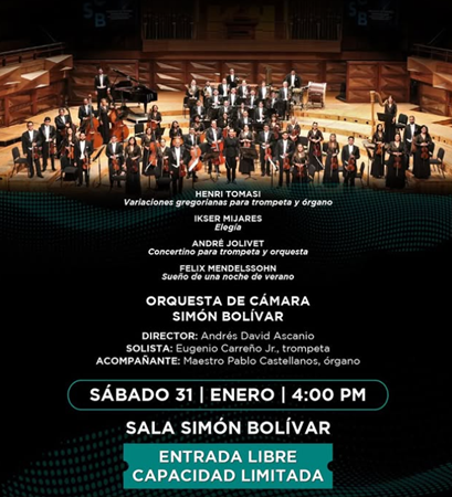 La Orquesta de Cámara Simón Bolívar se presentará en la sala Simón Bolívar, bajo la dirección del maestro Andrés David Ascanio.
