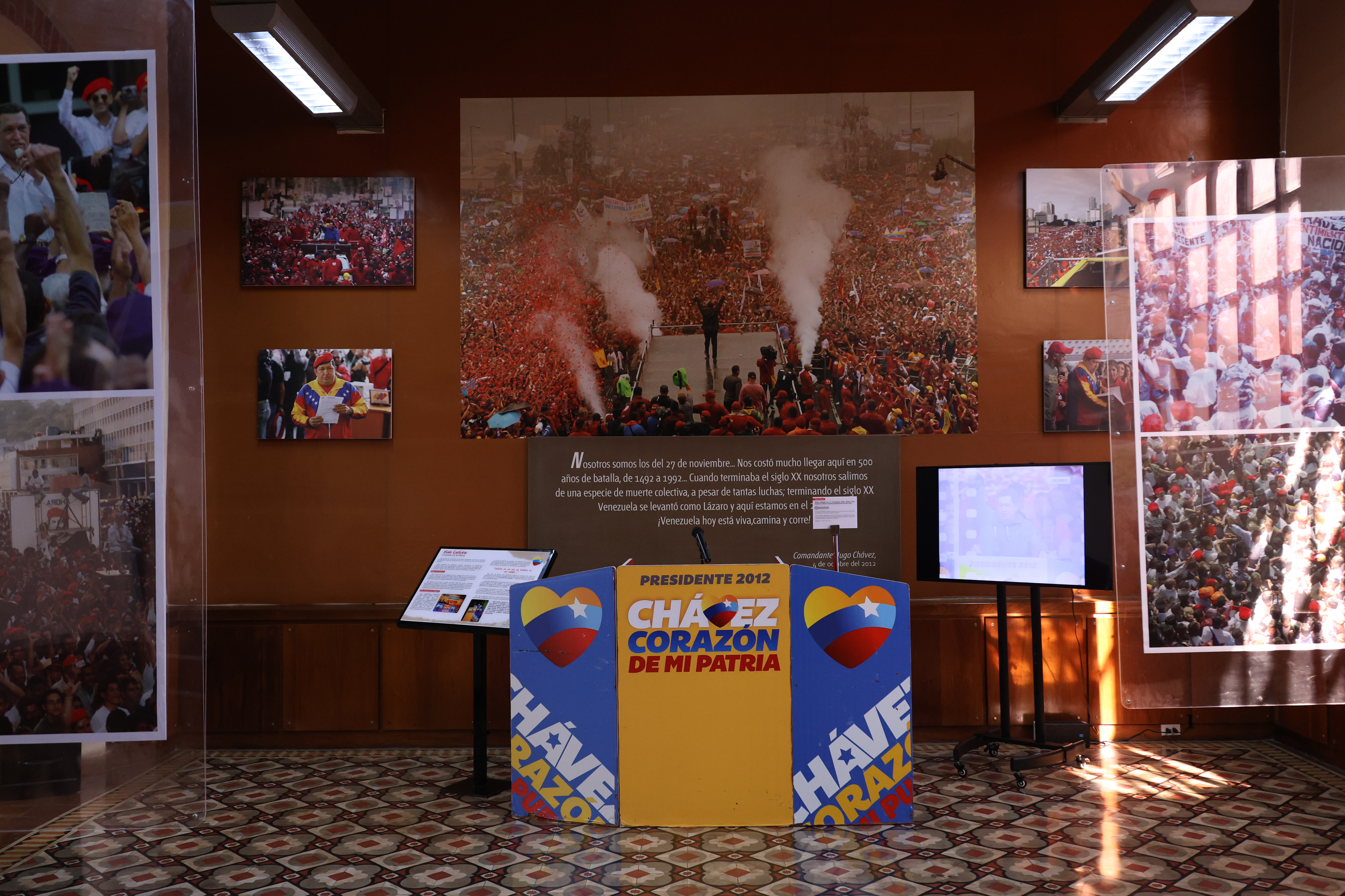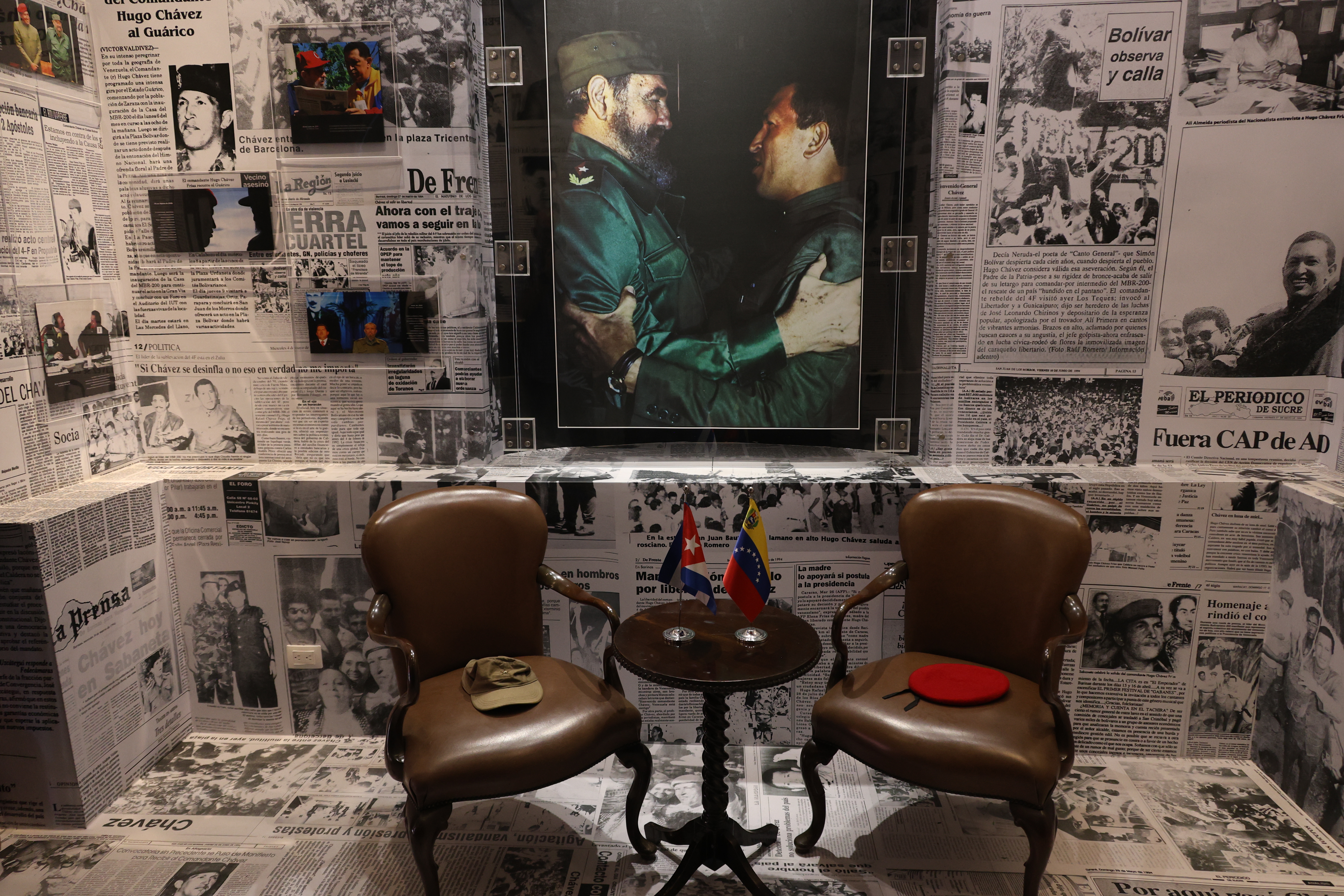 Por último, llegamos a la sala de la solidaridad Cuba-Venezuela, con variados retratos de Chávez y Fidel, paredes tapizadas de reseñas de prensa de la época, dos sillas, dos banderas de ambos países realzando la hermandad y cooperación de los pueblos…