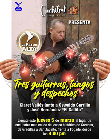 Tres guitarras, tango y despecho nos regalarán Claret Vallés, Oswaldo Carrillo y José Hernández "El Gallito".