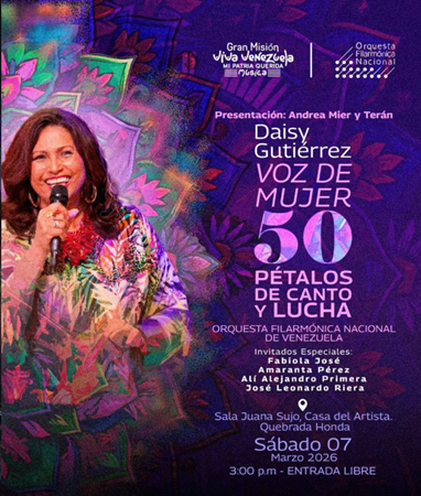 Daisy Gutiérrez: 50 pétalos de canto y lucha celebrará a nuestra querida Daisy acompañada por la Orquesta Filarmónica Nacional de Venezuela, patrimonio musical de la patria.
