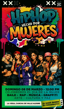 Este 8 de marzo conmemoramos nuestro día con arte y cultura en el sector Valle Alegre. Una jornada dedicada a potenciar el talento femenino en el Hip Hop hecho por mujeres, invita Hip hop hecho por Mujeres y la Asociación Civil Tinta violeta.