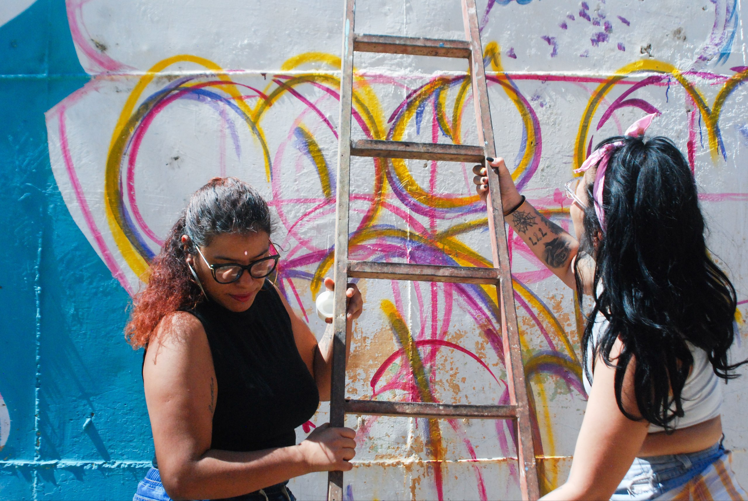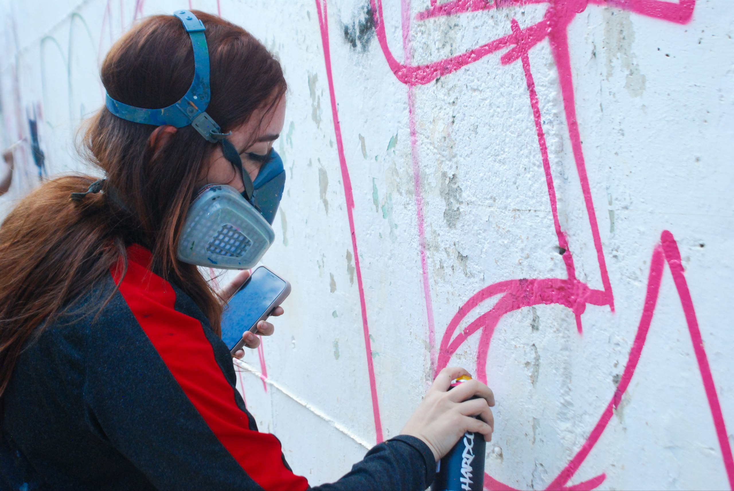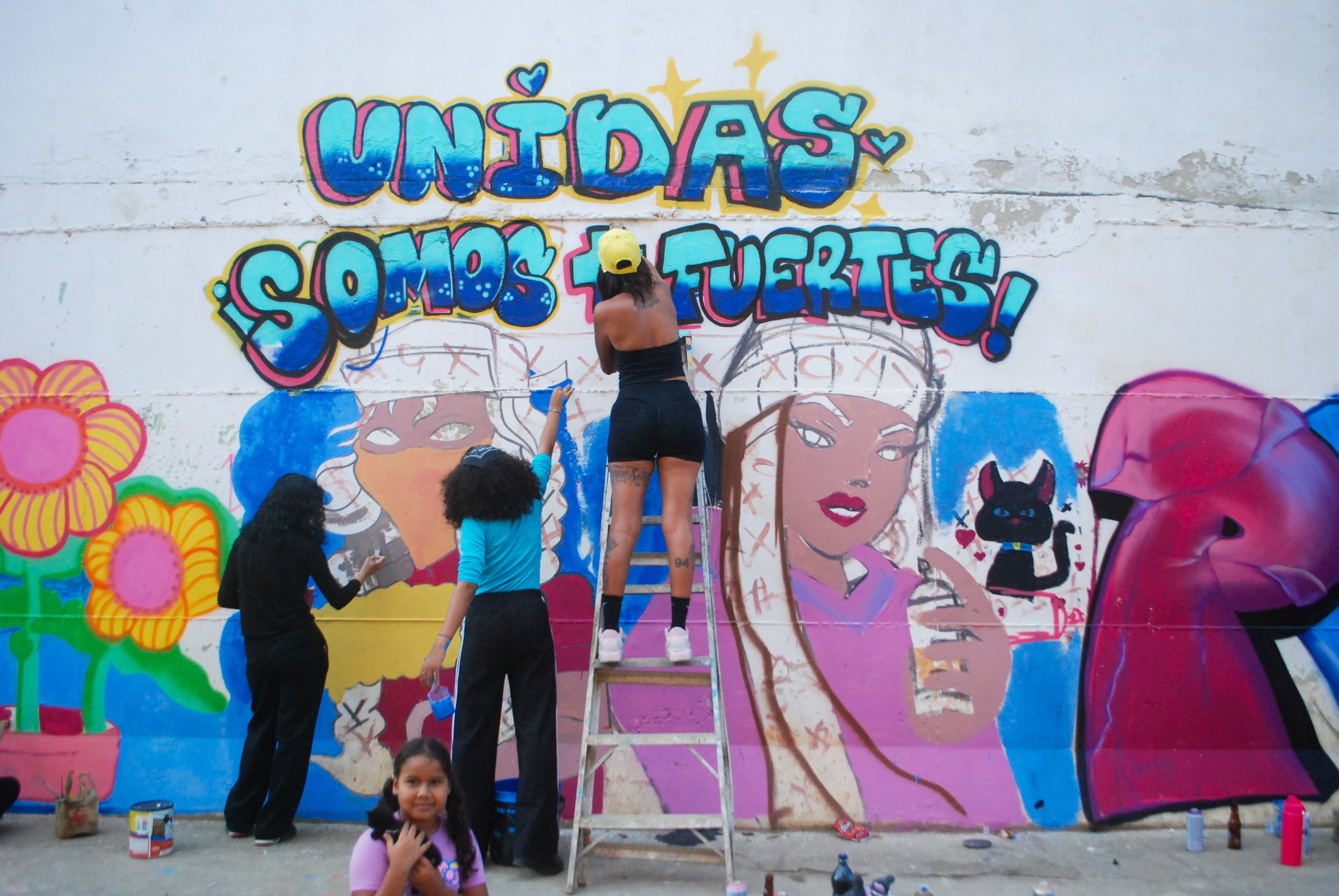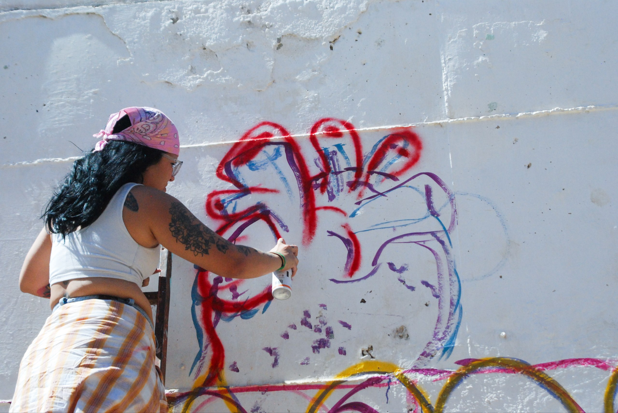 Las grafiteras expresaban con sus trazos lo que las palabras no alcanzan. Sobre el muro, figuras femeninas entrelazadas con símbolos del hip hop tomaban forma, reflejando la diversidad y fuerza del colectivo.