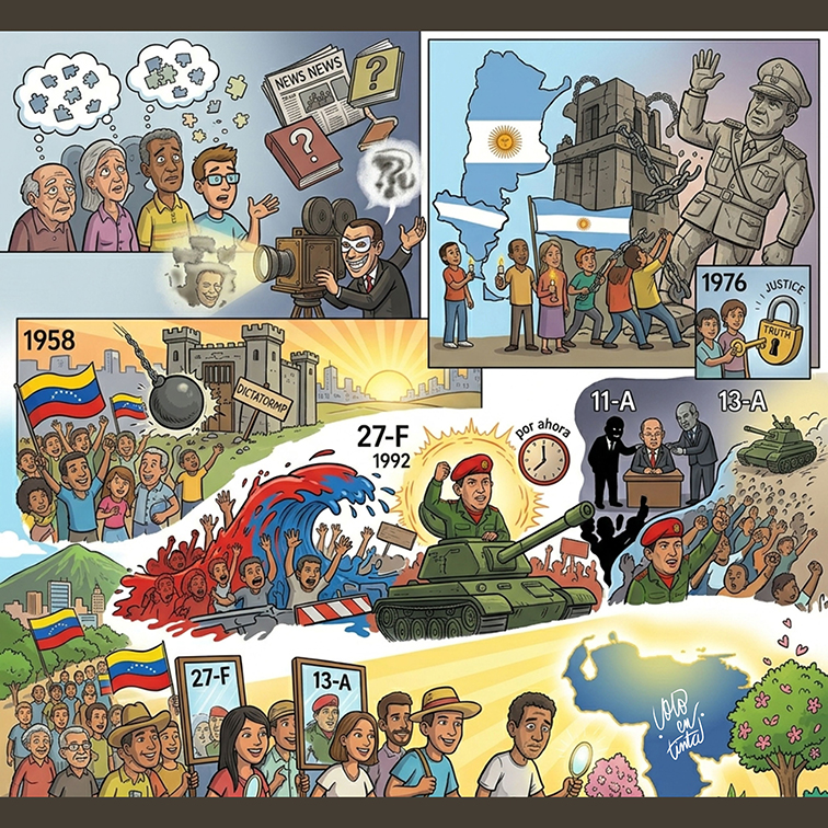 A 50 años del golpe de 1976 en Argentina (24 de marzo), la memoria se reafirma como un pilar democrático frente al horror. Argentina busca sellar heridas con verdad y justicia y no repitiendo los errores del pasado conociendo su propia historia. La historia de Venezuela recuerda el 23 de enero de 1958 como la caída de la dictadura de Pérez Jiménez. En ambos países el ejercicio de la memoria política se plantea como una vía para construir democracias sanas. La lucha y defensa de la verdad y de los derechos ciudadanos son lecciones compartidas en la búsqueda de ser dueños de sus propios destinos.