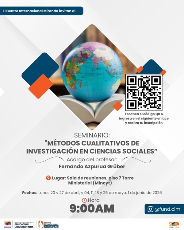 El Centro Internacional Miranda invita a participar en un seminario formativo, Métodos Cualitativos de Investigación en Ciencias Sociales, a cargo del profesor Fernando Azpurua Grúber. El seminario se llevará a cabo a lo largo de varias sesiones, programadas para los días lunes de abril, mayo y junio de 2026. Específicamente, los encuentros tendrán lugar el 20 y 27 de abril, el 04, 11, 18 y 25 de mayo, y concluirán el 1 de junio de 2026.