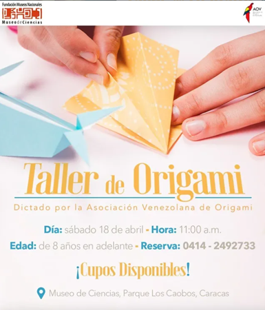 ¡El papel cobra vida en el Museo de Ciencias! Te invitamos a descubrir la delicadeza y precisión del origami en un taller familiar diseñado para despertar tu creatividad. Este sábado 18 de abril, junto a los maestros de la Asociación de Origami de Venezuela. ¡Los cupos son limitados!