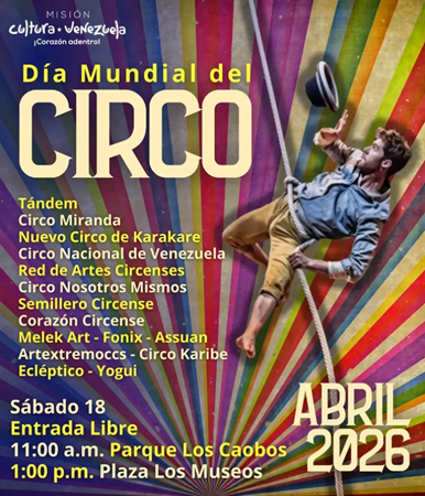 Una sola voz para celebrar el Día Mundial del Circo. Junto al Circo Nacional de Venezuela, el Mincultura y la Red Nacional de Artes Circenses, invitamos a toda la familia a disfrutar de una programación de lujo con el talento de nuestras agrupaciones y artistas.