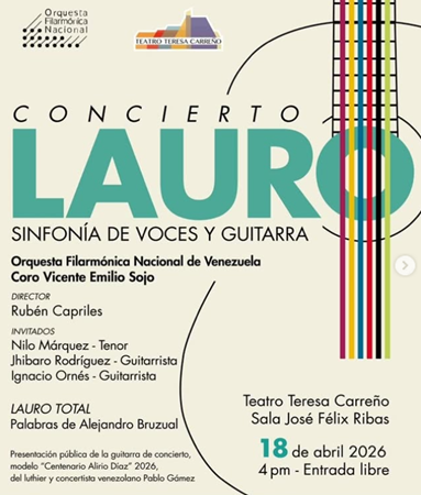 Lauro: Sinfonía de voces y guitarra, llega al Teatro Teresa Carreño a cargo de la Orquesta Filarmónica Nacional de Venezuela y el Coro Vicente Emilio Sojo. Presentación pública de la guitarra de concierto, modelo centenario Alirio Díaz 2026, del luthier y concertista venezolano Pablo Gámez.