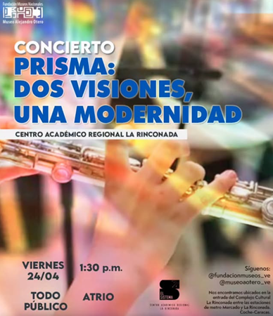 En el marco de la exposición Prismas Colectivos los invitamos a disfrutar del concierto Prismas: Dos Viciones Una Modernidad, en donde contaremos con la melodía y presencia del Centro Académico Regional núcleo La Rinconada, quienes nos deleitarán con diversas piezas de música clásica. Museo Alejandro Otero, La Rinconada.