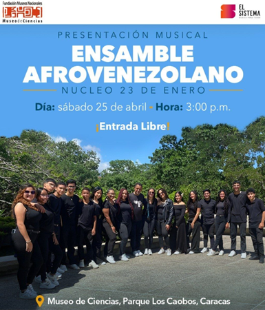 El Museo de Ciencias, en alianza con El Sistema en su núcleo de la parroquia 23 de Enero, los invita a la presentación musical Ensamble Afrovenezolanos.